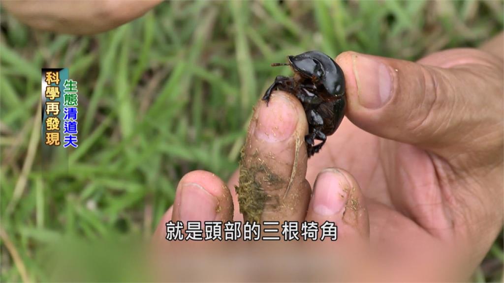 大黑糞金龜的外觀特徵,就是頭部的三根犄角,牠可以倒立起來接著以細長的後足,微向內彎的脛節抱住糞球滾動。