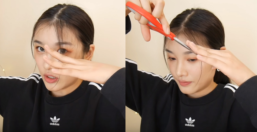 2.之後把頭髮拉著,在眉毛左右的位置,用剪刀斜斜地慢慢修下去。