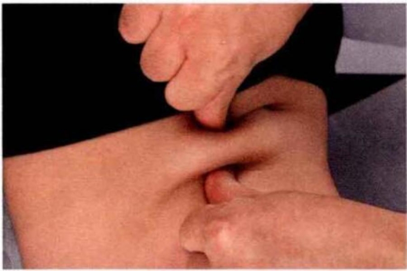 (2)扯痧法。用大拇指和食指將穴位上的皮膚提起又放下,這種方法流傳較廣,主要目的是讓扯痧部位的皮膚出紫紅色或暗紅色的痧點,以達到治療疾病的效果。還能用拇、食、中三指一起夾扯皮膚,但需要注意的是,夾扯時只能朝一個方向,可以重複多次,癥狀較重時可以加大力度,直至皮膚出現紅斑為止。扯痧時對皮膚有一種牽拉的力量,所以能夠引起人體的全身機體反應,使患者的局部有疼痛感,但是在扯過之後,又會讓患者全身有一種輕鬆感。這種方法主要適用於氣海穴、關元穴、命門穴。對於因腎虛引起的內濕、內熱有較好療效。