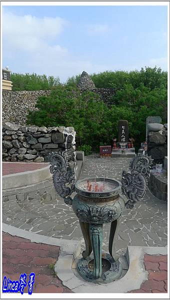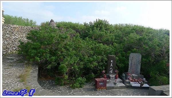 寫著「七美人塚」,後方還有高聳石塚,然後有工作人員點