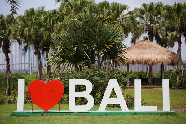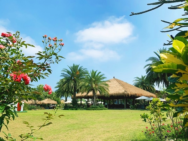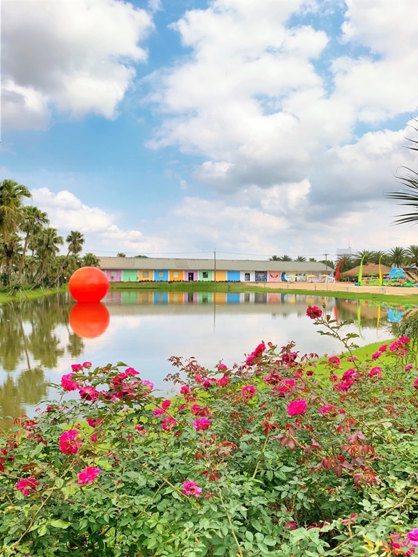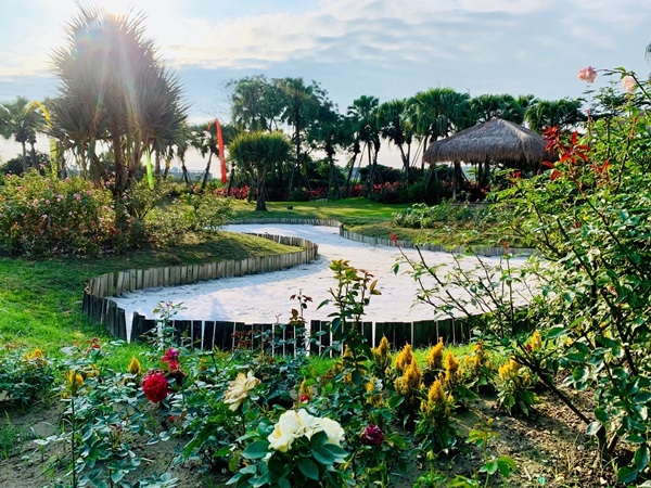 來到峇里景觀區,寬闊綠色草原,小朋友可以自由跑跳,我愛BALI的字樣一定要和它入鏡,其中更可見嬌貴的身影處處搖曳,園區陸續種植好多各式品種的玫瑰花,以茶玫及蔓玫為主,花正開得燦爛,五顏六色、繽紛多彩、令人目不暇給。草原區兩側設有茅草屋、發呆亭與棕櫚樹隨處可見,茅草都是由峇里島真正海運進來的,真得猶如親臨峇裡島般的愜意!