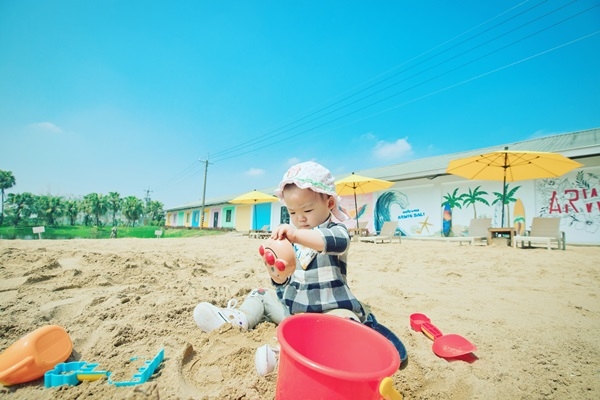 穿過廊道,便可遇見國內首創的人造沙灘海岸戲沙池,雪白細沙十分乾淨,是小朋友的最愛,玩上一整天也不會膩,大人們則可以閒坐於茅草屋,或是選個陽傘躺椅賞景,何等悠閒自在。沙灘區不定期舉辦活動,今年暑假將推出沙灘遙控車大賽,敬請密切注意FB公告日期。而最大亮點是沙灘旁有一條彩繪牆,3D塗鴉牆夢幻翅膀、立體字母牆等,都是工作人員自己畫的,不僅為園區增添繽紛色彩,也是大家一定要留影的吸睛畫面。