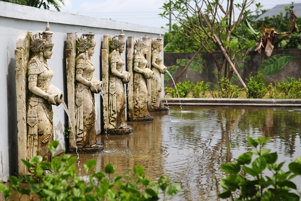 漫步於庭院造景廊道,不同區域景觀各異,粉色、白色雞蛋花、海芒果、白水木、扶桑花等南洋植栽,還有水池造景、石雕藝品、彩繪衝浪板等,每一區塊,都是雅聞別出心裁設計打造,例如「千手禮佛」、「湧源幸福」(寓意永遠幸福)。