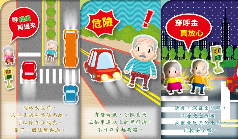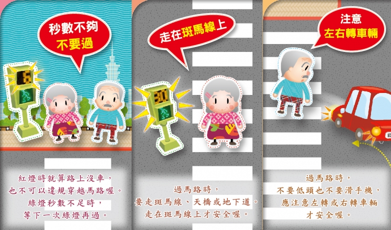 交通局特別呼籲年長的市民朋友,過馬路務必依規定行走行人穿越道設施,不可任意穿越車道,遵守行人號誌通行,於路口小心慢、看、停後再通過,隨時注意左右來車,秒數不足不急著過;如於清晨、深夜出門時,穿著亮色衣服或戴反光配件,以確保自身安全。