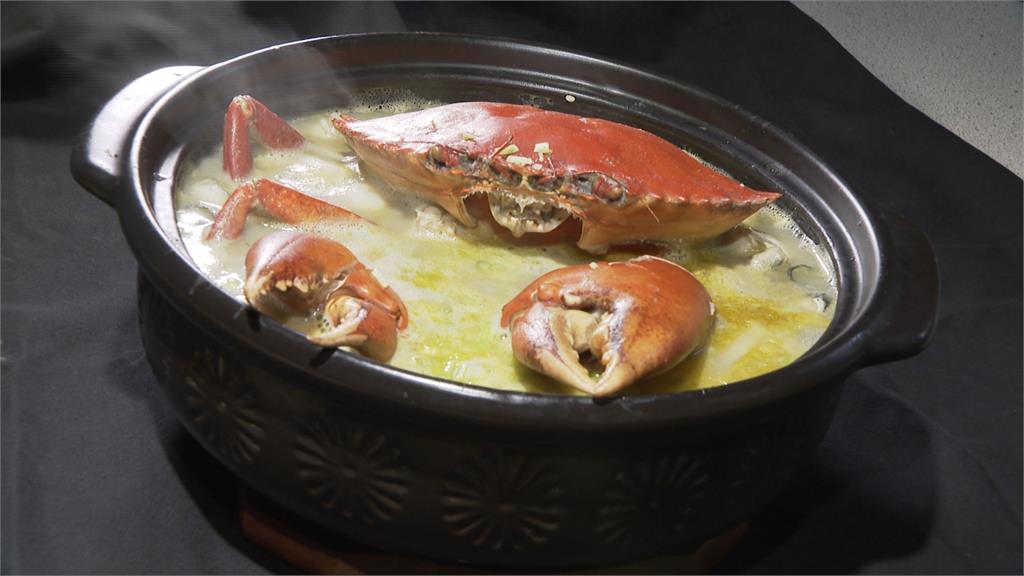 這道螃蟹粥,料理費工夫,海鮮全是當天從澎湖空運來台,先用芋頭、蛤蜊、白飯煮粥底調味,最後再放入螃蟹,煮到滾泡才上菜,一口喝下料比粥多。