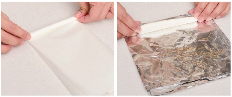 - 將數張烘焙紙捲起黏貼好,外層包上兩層鋁箔紙, 製作出1 條長約14cm 的紙卷模型,外層抹上溶化奶油。