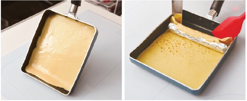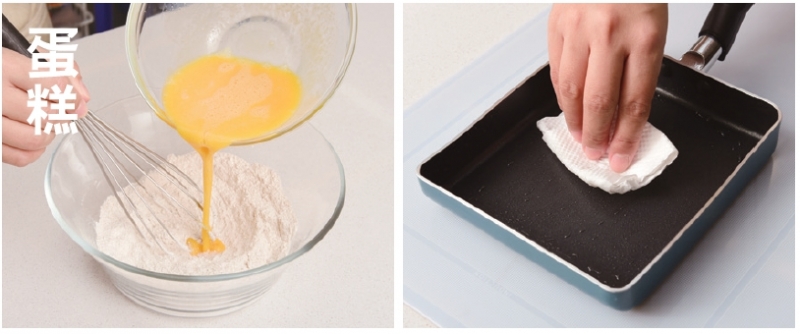 - 以中小火加熱長方形平底鍋,用廚房紙巾在鍋底抹上一層薄奶油溶液(分量外)。