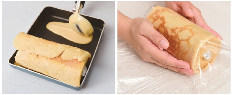 - 邊緣放上紙卷模型,輕輕捲起蛋糕皮。重複以上步驟直至完成。關火,用保鮮膜包好蛋糕定型,待涼。