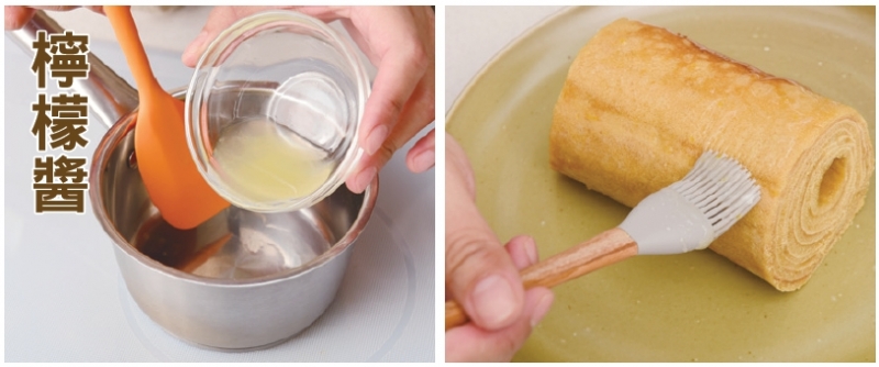 - 將糖粉、檸檬汁及熱水攪拌均勻,取出蛋糕內的紙卷模型,刷上檸檬醬及撒上檸檬皮,切塊享用。