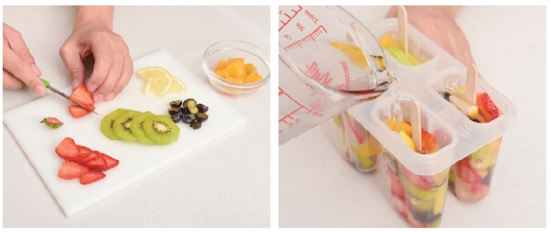 - 將鮮果放入冰棒模,倒入椰子水,插入木棒。放入冷凍庫冷凍一夜。