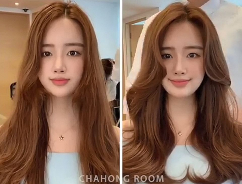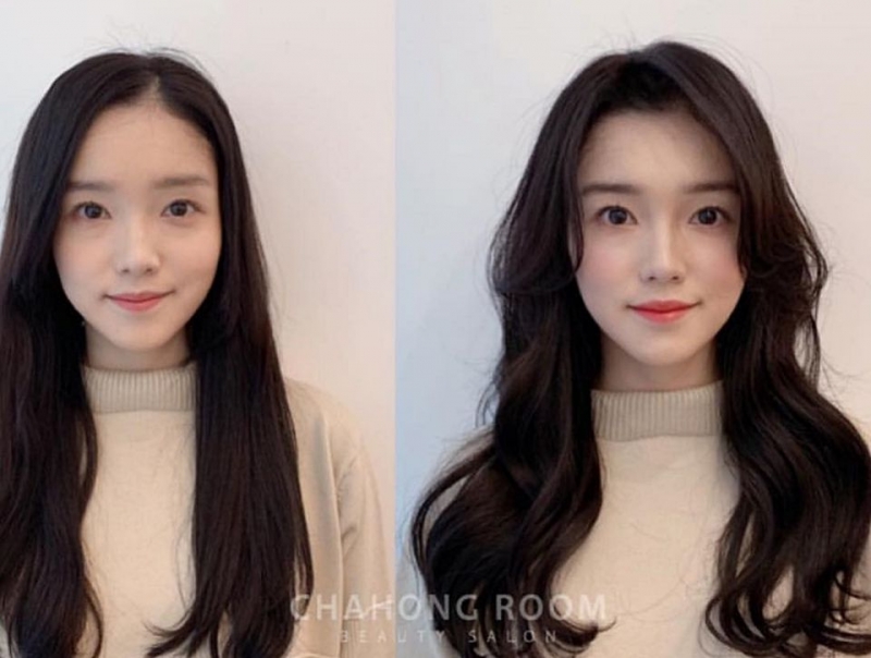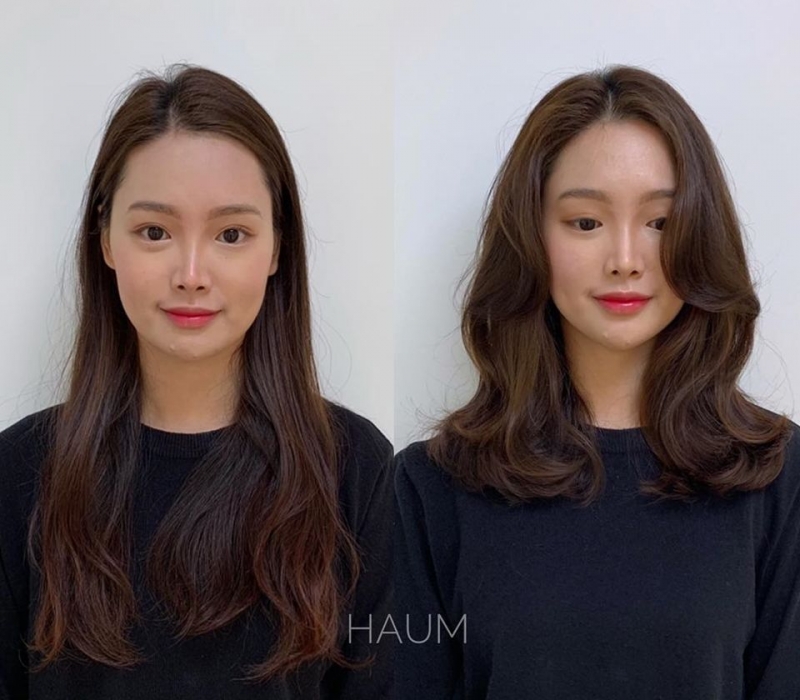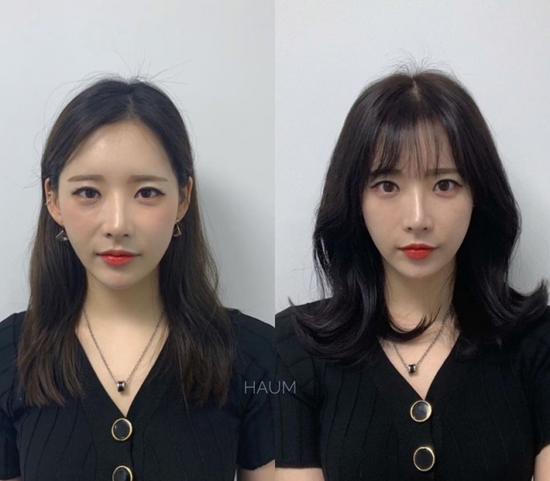 這位小姐姐左邊瀏海太貼額頭、反而更凸顯額頭寬大的問題,而右邊外翻的瀏海帶出空氣感,瞬間弱化了額頭的線條、顯得整張臉臉型更順暢。
