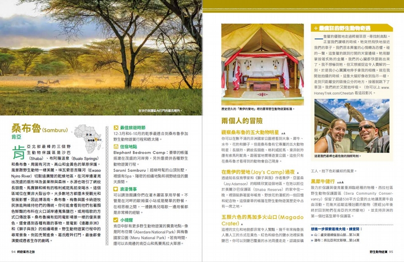Elephant Bedroom Camp:豪華的帳篷搭建在茂盛的河岸旁,另外還提供各種野生動物遊賞行程。Saruni Samburu:超級時髦的山頂別墅,裡頭有Spa、隱密的拍攝地點和視野絕佳的露天房間。