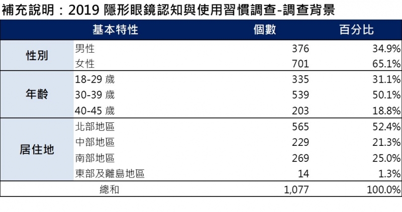 數位化時代來臨,在網路技術成熟且行動裝置普及度高的背景下,對手機、平板、電腦等科技產品的依賴程度也越高,觀看螢幕的時間也就越長,雖便利與豐富了生活,但同時也為眼睛健康帶來可能之風險,其中近視為最常見的視力問題。一般來說,配戴眼鏡為近視矯正的主要方式,但不少民眾為了方便、美觀或符合工作需求因此也會選擇隱形眼鏡來取代傳統眼鏡,隨著隱形眼鏡市場越來越大,所推出的產品自然也越來越多,為了能進一步描繪出在此背景下國內使用者更為鮮明的輪廓,Pollster波仕特即時線上市調網特別針對1,077位18-45歲且每週平均至少會有一天使用隱形眼鏡之民眾,針對隱形眼鏡認知與使用習慣等議題進行調查。