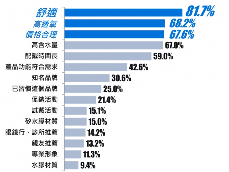 在隱形眼鏡選擇面部分,主要可分為以消費者為主的產品購買選擇與以專業驗光人員為主的產品規格選擇,由於隱形眼鏡是個極為貼身的產品,故每個使用者自身需求可能具明顯差異,進而影響產品選擇時所重視的項目也可能有所不同。受訪者根據本次調查在選擇隱形眼鏡較重視的因素中,逾八成(81.7%)較重視因素為「舒適」,其次依序為「高透氧」(68.2%)、「價格合理」(67.6%)、「高含水量」(67.0%)與「配戴時間長」(59.0%)。整體來說,受訪者選擇隱形眼鏡時較為重視的因素多與「產品特性相關」,進一步分析產品特性相關因素之重視程度,卻發現「矽水膠材質」(15.0%)、「水膠材質」(9.4%)之比例明顯相對較低,可得知民眾對於材質之認知與熟悉度皆有所不足,若不知道各材質的重要性及其所具備的優點及特性,自然不會將材質列為產品選擇的重要因素之一。