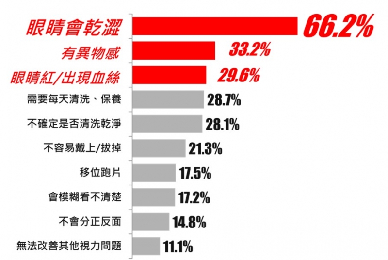 在隱形眼鏡使用頻率與時間漸增的背景下,自然也會於配戴方面出現困擾,受訪者平常配戴隱形眼鏡時三大主要困擾分別為「眼睛會乾澀」(66.2%)、「有異物感」(33.2%)與「眼睛紅/出現血絲 」(29.6%),而最主要困擾出現的比例更是次要困擾的2倍,可知其影響廣度之大。此外若偶爾配戴有不舒適的感覺時,主要會採取「減少配戴的時間」(58.5%)與「減少使用頻率」(48.2%)此類型刻意改變自身習慣的方式,僅34.0%的受訪者是採「更換成其他品牌」此種較為主動的方式,此外有32.6%甚至是採取「若不嚴重就應該不會特別處理」,由上述結果可發現,若配戴時偶有不適感則大多是以較為消極被動的方式處理。
