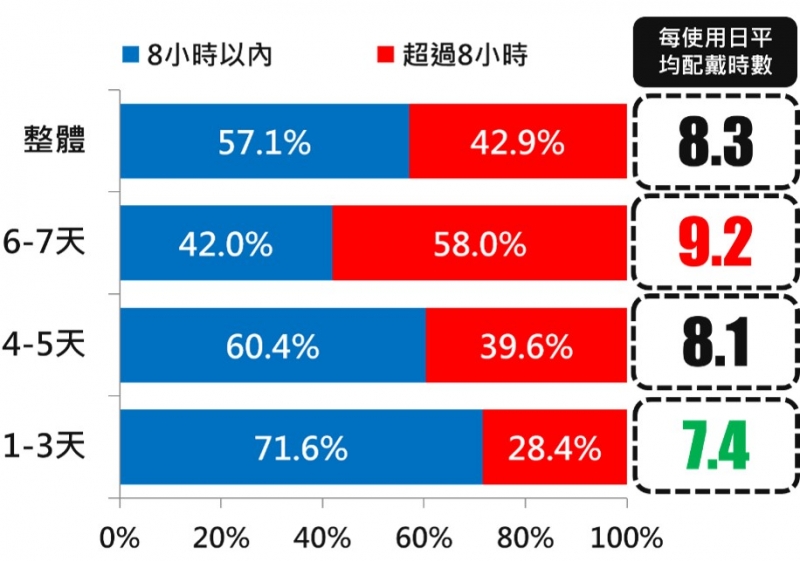 圖1 不同使用頻率之每使用日平均配戴時數之分布狀況
