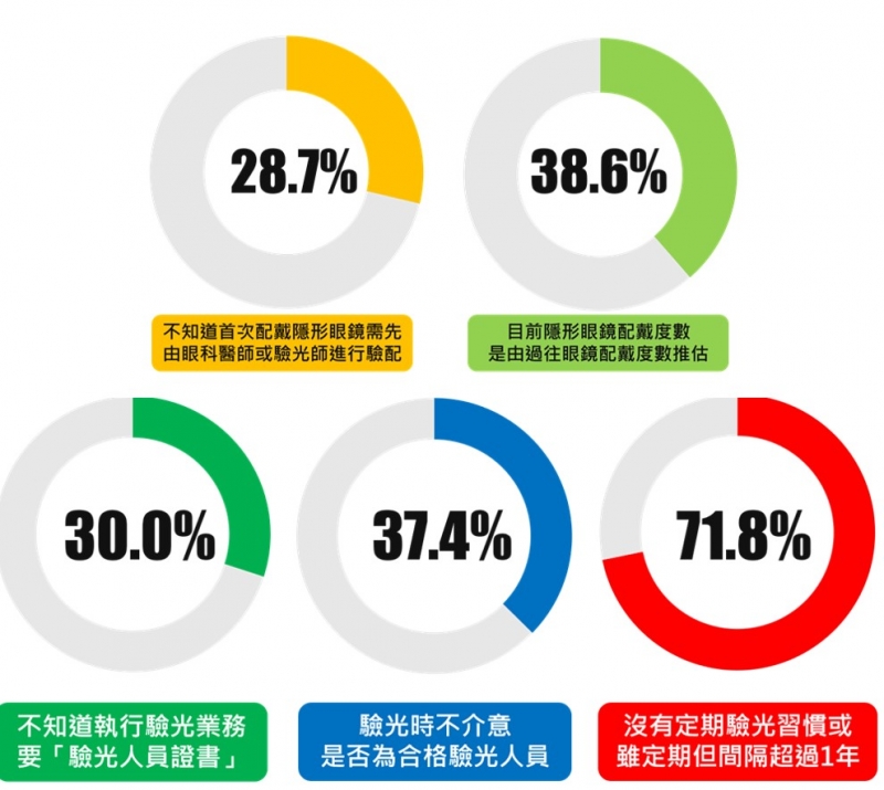 驗光人員是否專業對於產品規格的選擇具有極大的影響,但根據調查結果發現有三成(30.0%)受訪者並不知道需要取得「驗光人員證書」才能執行驗光業務,且有37.4%的受訪者在進行驗光時甚至不介意執行者是否為合格的驗光人員,顯示部分國人對於驗光人員專業性的重視度欠佳,合格的驗光人員除了能提供度數資訊外,同時還會參考角膜弧度、直徑等較為專業的指標進而給予使用者在產品選擇上更為適切的建議。