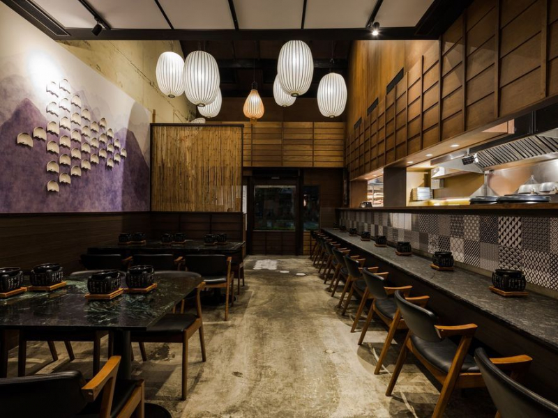 屋舍內部前段挑高,使足步由闊至窄有如探幽,錯落懸掛的長燈籠便成為引路燈,引人驅身向前同時目光環視——天幕由染色木材排闥構成斜屋頂,繞過竹片屏風,是精選日式風花磚拼貼而成的吧台,以及靜雅的墨綠、灰晶餐桌各就其位;而眼前所有風土物件的在場,更無聲圍塑老店方得醞釀的古味風華,將傳統美學與文化記憶在此召喚復甦。