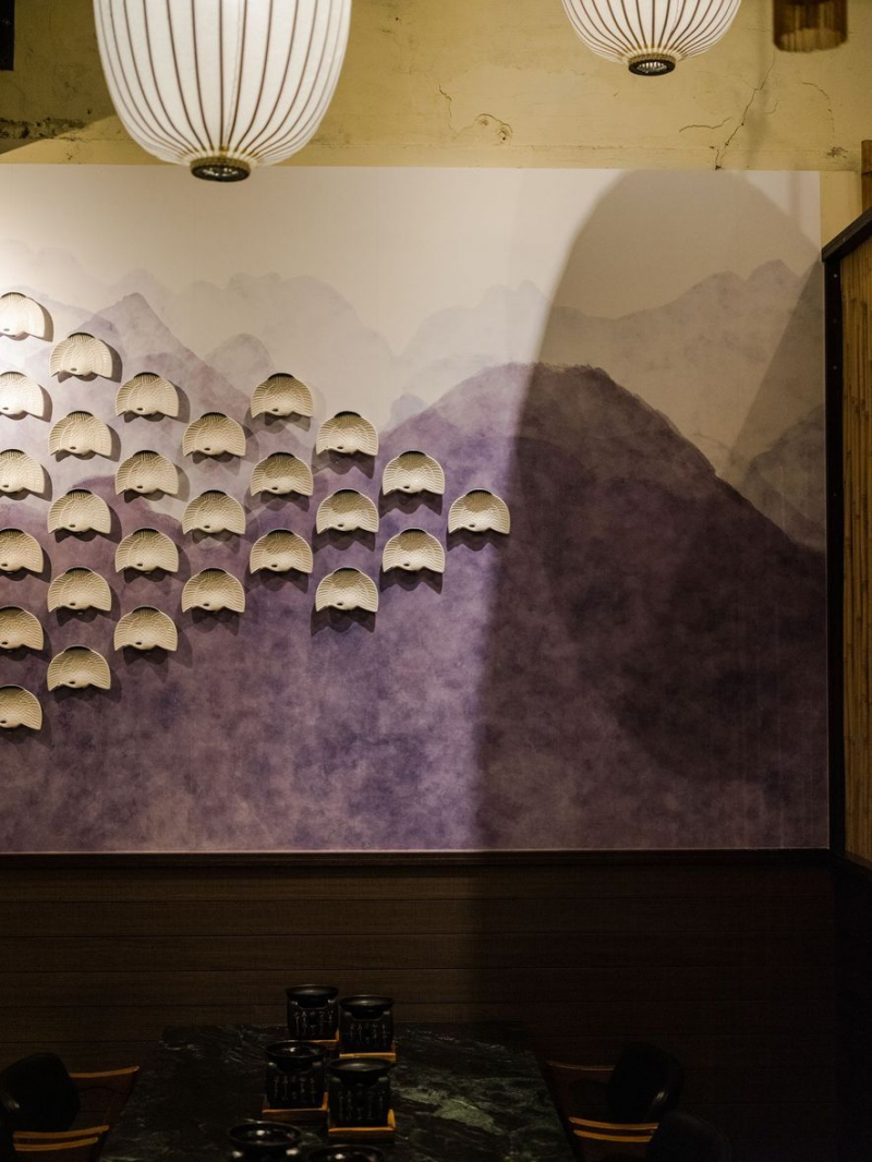 (圖)座位區牆面所彩繪的紫山藍水一路綿延,其上白盤如鶴群飛,有如為餐廳空間添賦悠然的遠古傳說。
