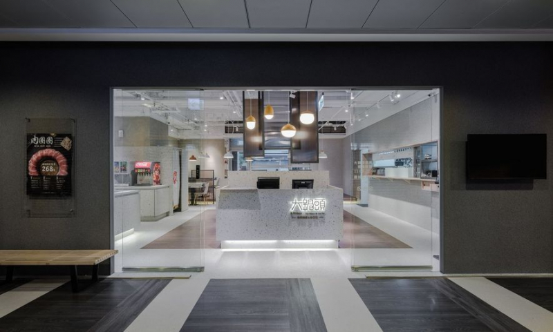 置身於南台灣人流與商店高度密集的車站大廳內,設計團隊將《奉食主義》定調為提供旅人迅速獲得身心舒緩的餐飲所在,因此選用爽利的灰白色系為基調,一則特出於其他五花八門的店面風格,另外更襯托出鍋物要角——肉的鮮色香氣。在一片白淨當中,天花板搭配採用挑空設計,展露出縱橫管線並整合內部迴路,其筆直線條對應寬闊的過道動線,顯示出場域有條不紊的理性氣息。