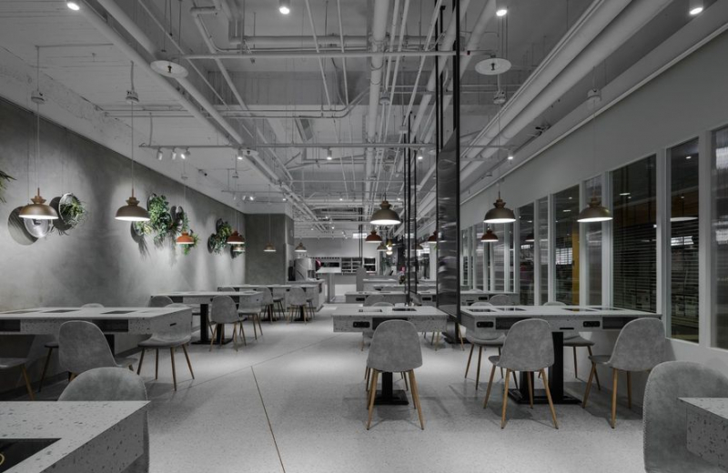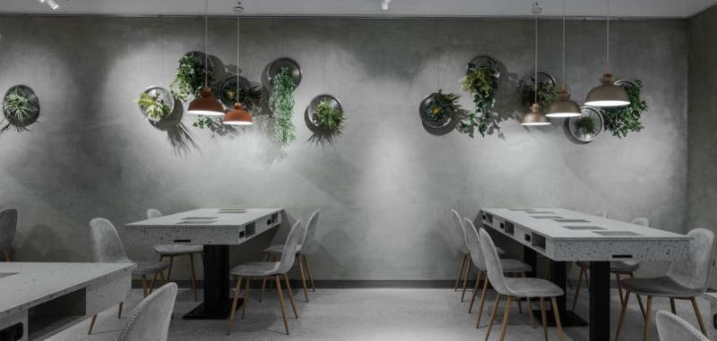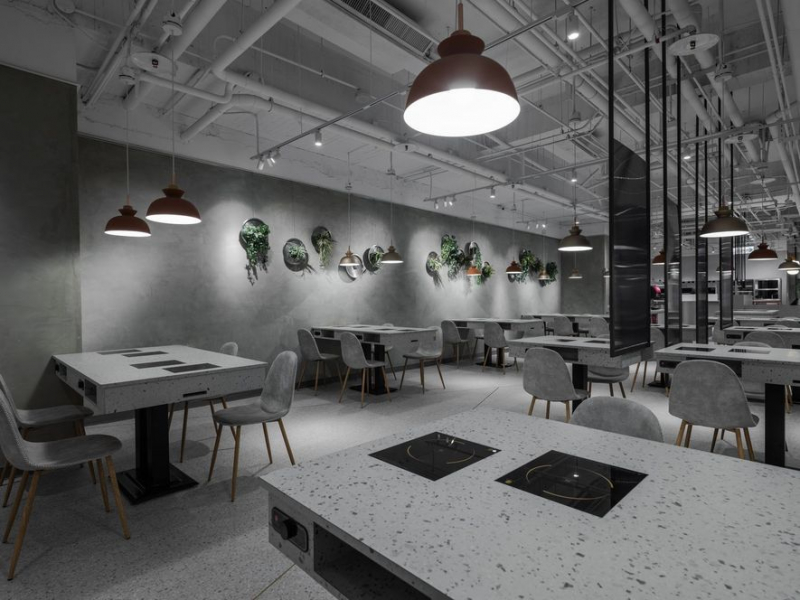 因應場景紋理,桌椅選材相應使用磨石子樣式,以融入背景的手法塑造輕盈流暢的空間感;此時餐區牆面躍出的永生綠植便成了亮點,團隊精心結合該店家特製的鍋蓋,將日常用具與藝術花藝融合如畫,同時建構出自然與人文的雙重視野。至於供食走道則置於座位區中央,且拉寬間距,提供綽綽有餘的出餐及錯身空間;並懸掛深灰中空板隔擋視線鄰桌視線,使兩方皆保有最佳的用餐隱私。