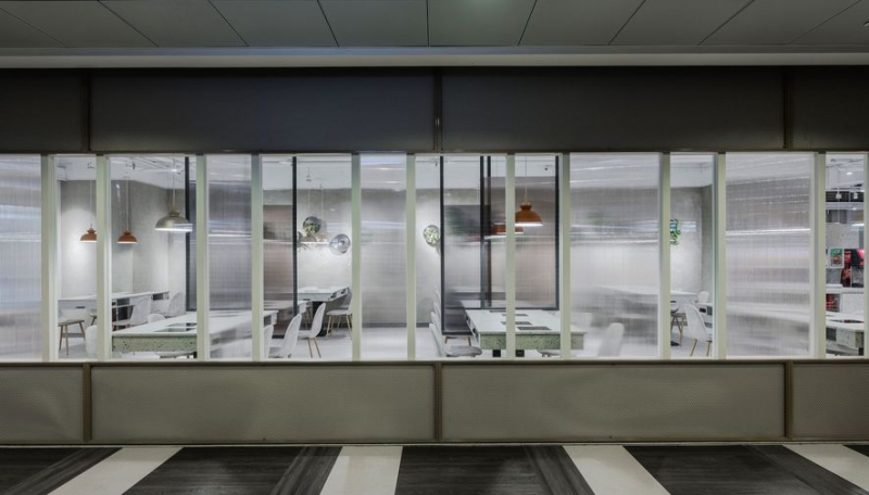 (圖)隔窗採用若隱若現的中空板與透明清玻,上下接連鐵件金屬網,吸睛設計既通透又隱蔽。