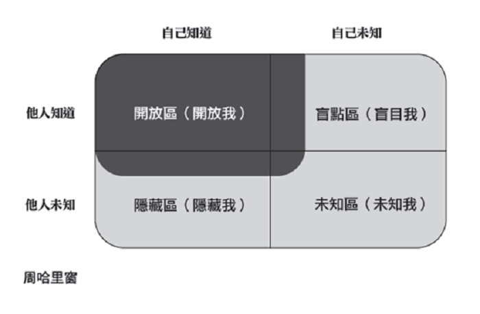 是自己和他人都知道的部分。如果這個部分變大,意味著開放度增加。當自我揭露度,也就是讓他人了解自己的程度增加,而且對他人的敏感度也增加時,開放度就會增加。當我開始利用自己的優勢,勇於了解自己的缺點時,開放我就會成長。