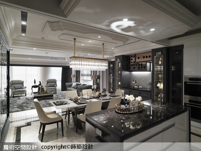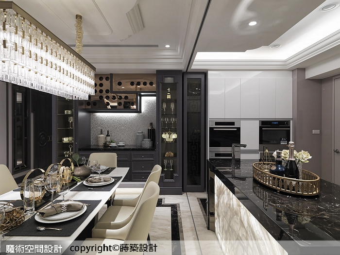 2.朱皇蒔設計師運用新古典風格剛柔並濟的特質,將豪宅氣勢與柔性品味掌握得恰到好處,規劃上公領域大器、私領域細膩,大量收納機能不落痕跡,藉由精美展示櫃或隱藏式壁櫃、牆櫃化解。