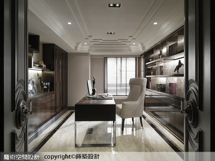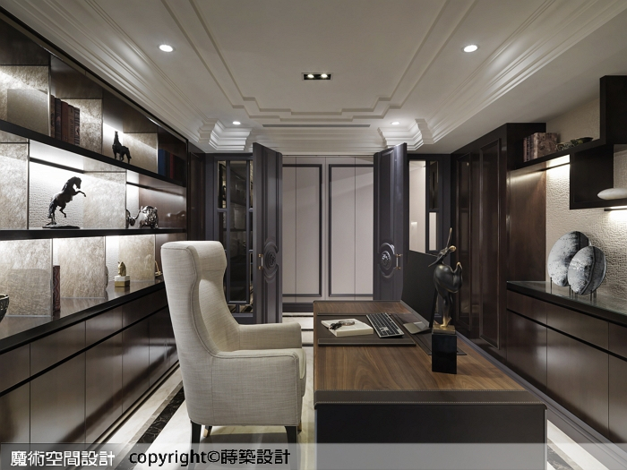5.書房承襲歐式古典對開門形式,氣宇不凡,沿牆設置沉穩展示收納櫃,間接光源搭配立體壁紙及夾紗玻璃,加倍烘托收藏品的燦亮輝煌。