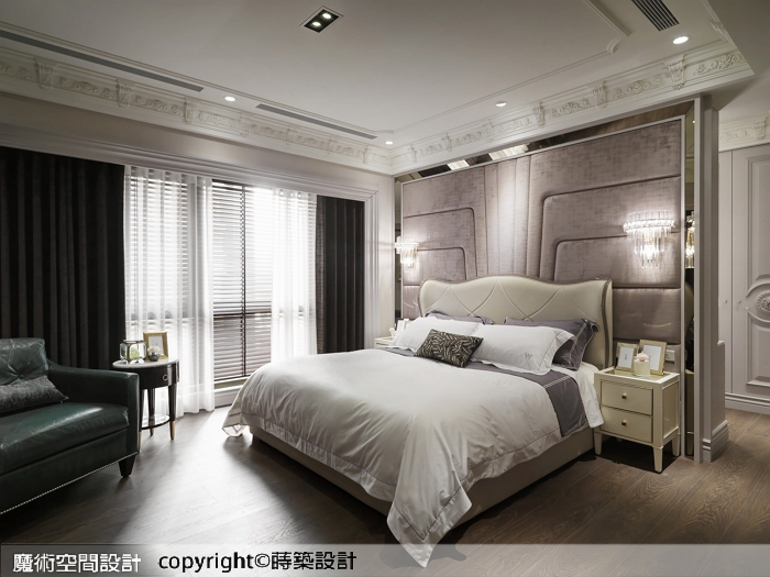 6.主臥床頭以茶鏡導角框飾,質感繃線裱板襯托對稱水晶壁燈,再加上天花浮雕線板,雍容典麗,更衣室媲美高級精品店。