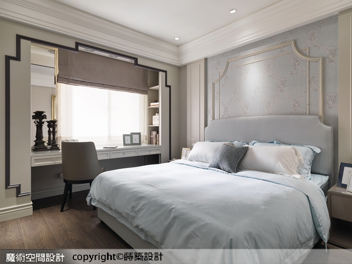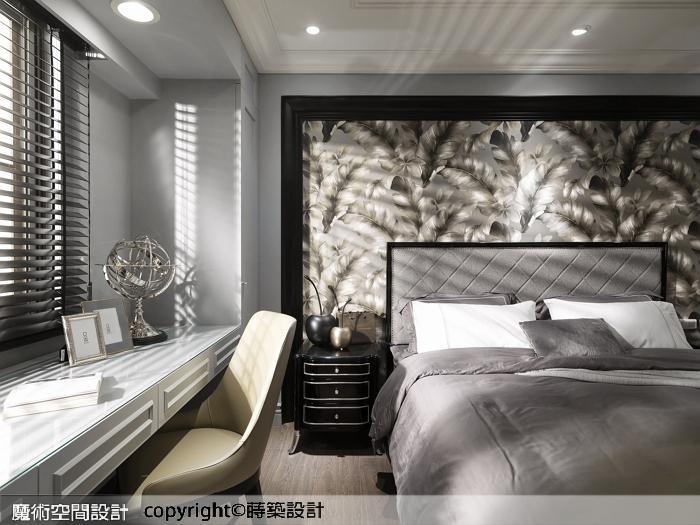 ▲屋主兒子的新婚套房,以帶入雅致壁紙的中性色調為主,主牆裝飾線條與窗框呼應,增添柔和氣息。