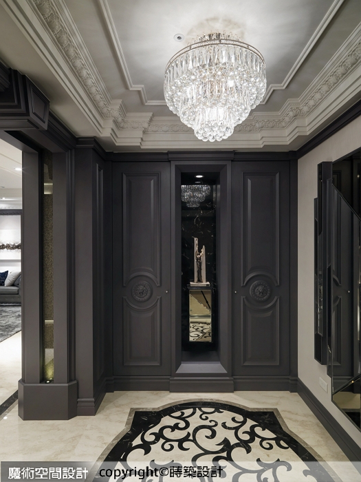 ▲以造型櫃體為牆圍,新建立的玄關區,裡裡外外及天地壁面,無一不精雕細琢,營造出富麗堂皇的迎賓門廳。