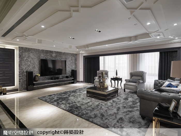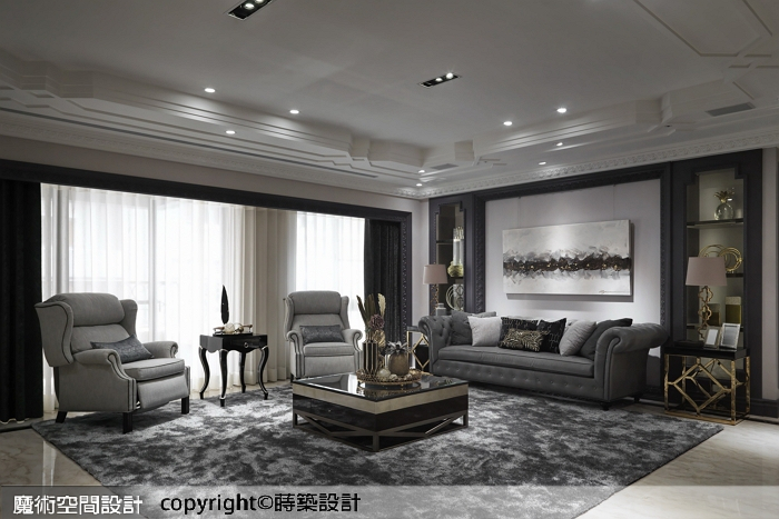 ▲以不同質感的深淺灰所構築的客廳,在精緻雕飾的窗簾框、修飾樑柱的層疊造型天花下,洩漏了藏不住的低奢。