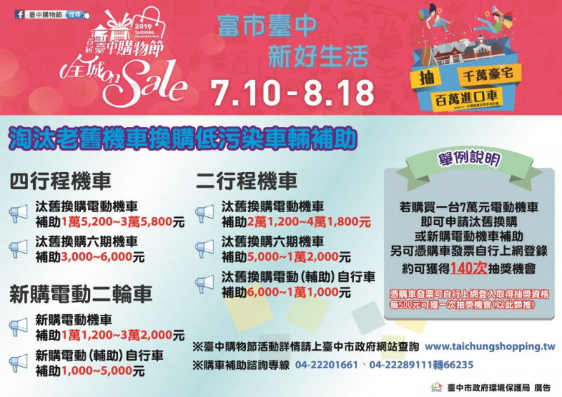 環保局指出,台中購物節已於7月10日登場,活動至8月18日止,凡於活動期間內在台中市商家消費,並至活動APP登入發票,金額累計滿500元即可參加抽獎,獎項包含千萬豪宅、百萬名車、電動機車、電器產品等多項好禮,詳情可至購物節網站查詢;換購電動機車補助問題,可電洽專線04-22201661。