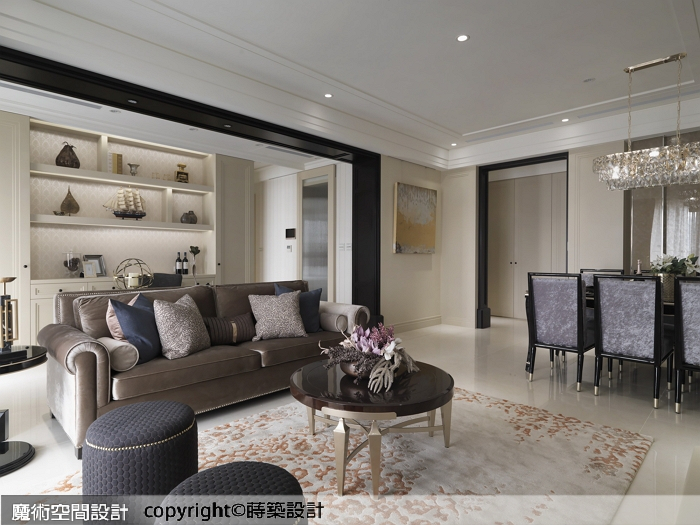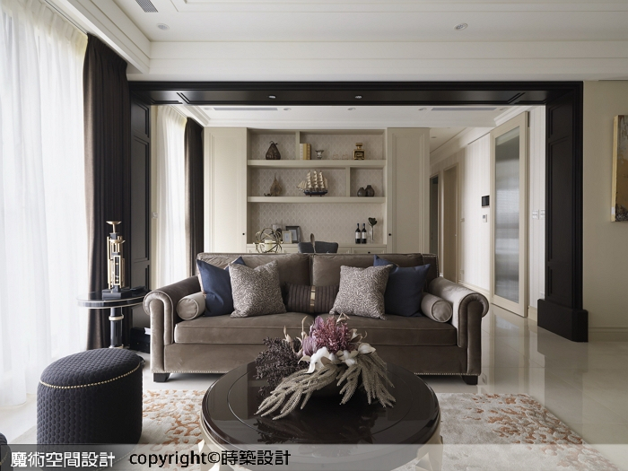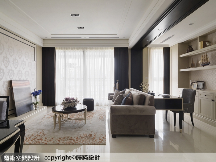 1.蒔築設計朱皇蒔設計師將略呈橫向的L形結構,於入口處增闢低奢玄關,大器門面隱含大量收納;再將長邊以框架分割屬性,劃出客廳與書房分界,重新界定後的每個場域更能聚焦。