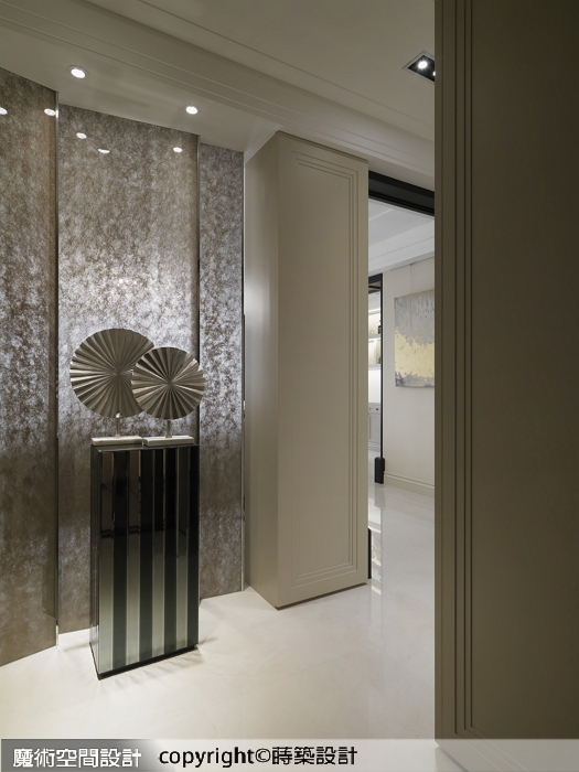 1.蒔築設計藉由三片金絲玻璃不規則走向所拼接的玄關隔屏,烘托前置藝術擺設,營造了輕盈律動璀璨內蘊的入門映像。