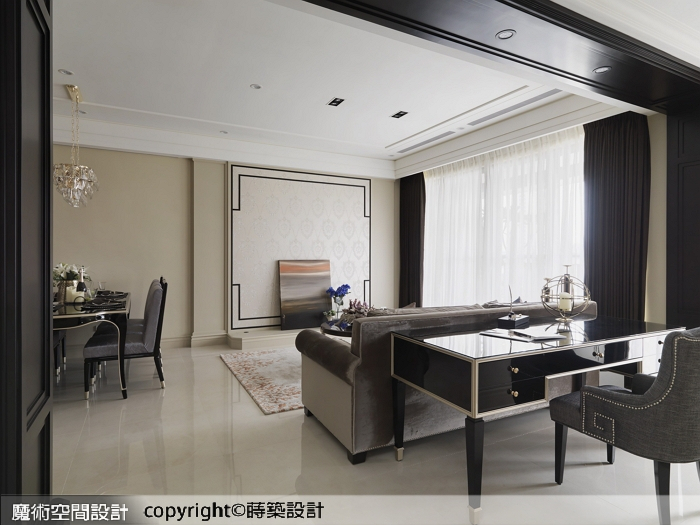 ▲尺度寬暢的客廳空間,依樑位採取裝飾框界定場域,讓沙發後方成為開放式書房。