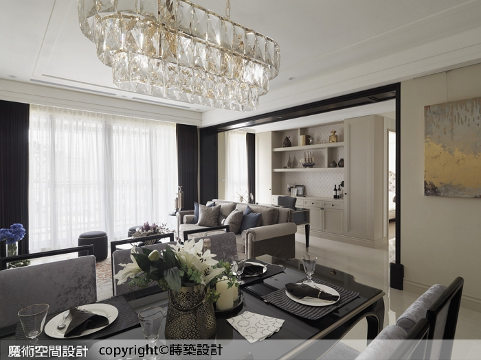 4.蒔築設計朱皇蒔設計師以訂製傢俱呼應整體精緻度的餐廳,共享了客廳及書房的採光,再加上無隔間鋪排,讓用餐視野顯得開闊明亮。