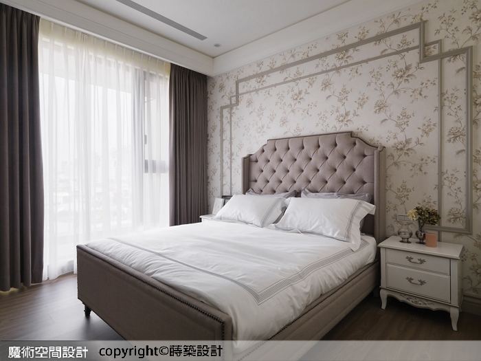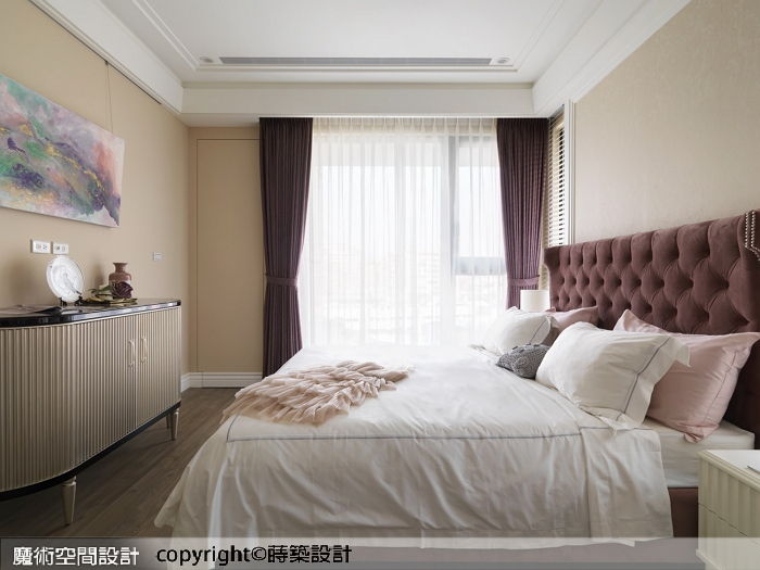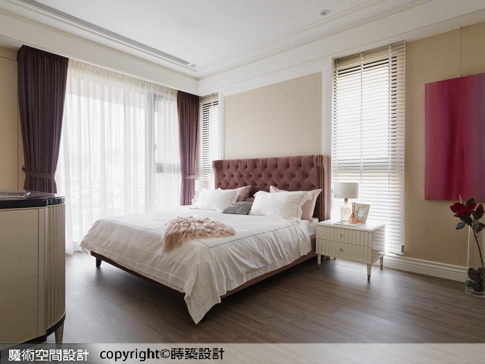 5.坐擁角窗位置的主臥採光明亮,遮光設計選用百頁簾與布幔搭配,滿足機能並增加變化,而原本落地窗左側畸零地也以無痕牆面修飾,多出收納空間。