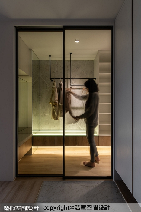 1.入口玄關處規劃衣帽間,且加裝玻璃門片,搭配上下方嵌燈所透出的暖黃光線,營造簡約時尚感,也讓人一進門便對室內環境留下深刻印象。