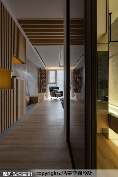 ▲由玄關通往客廳的走道開始舖設木地板,天花則以木格柵修飾,走道左側則設置儲物櫃,門片的格柵造型與天花相呼應,創造完整視覺效果