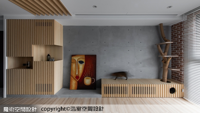 ▲客廳電視牆使用仿清水模板材,沒有多餘的造型或色彩,僅有在下方設計矮櫃以及在靠窗處裝設貓跳台,在粗獷之中展現細膩風情。