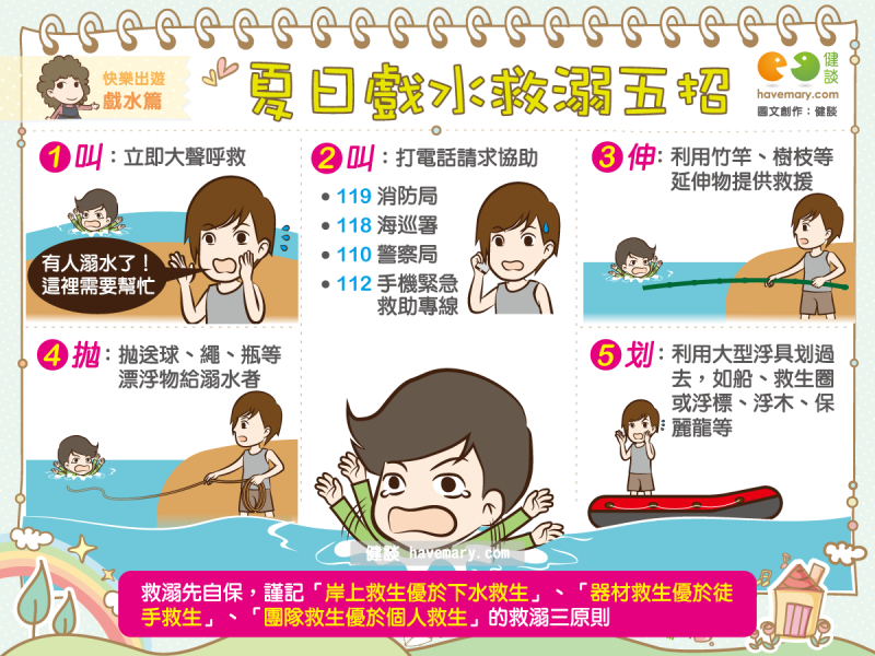 夏日戲水最消暑,但每年都有不少人因意外溺水而亡,為防範戲水可能發生的危險狀況,教育部體育署推動「救溺五招」,以期能避免憾事發生。