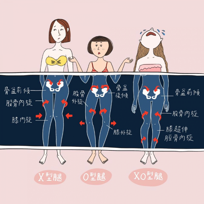 就像上圖中說明的,X型腿多半是骨盆前傾、O型腿多半是骨盆後傾,骨盆的問題除了會讓腿呈現X型或O型,腿從側面看起來也會更歪斜,無法呈現出一條好看的直線。