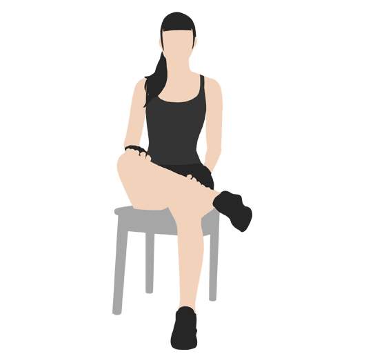 坐在椅子上,將左腳放置在右腳大腿上,像是翹二郎腿的坐姿,雙手可以放在大腿上保持固定,將上身向下壓,此時應該會感受到左邊臀部外側有一股被拉伸的痠痛感,動作維持30-60秒後換邊,重複3round。