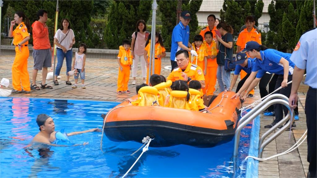 穿上橘色制服,小朋友們化身小小海巡人員,拋出救生圈營救落水民眾,除此之外還要搭上橡皮艇。船艇在水面上漂,泳池模擬海洋,既安全又臨場感十足,加深小朋友們防溺救生的觀念。
