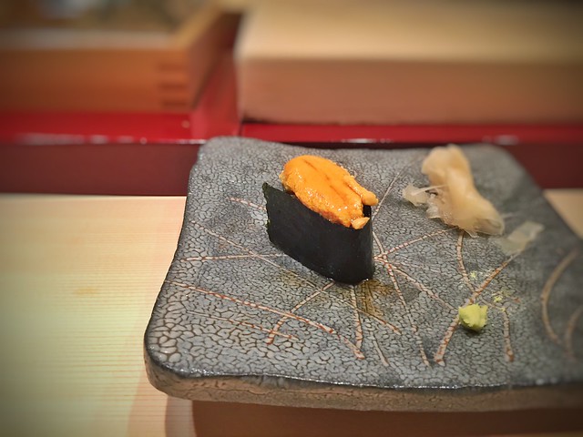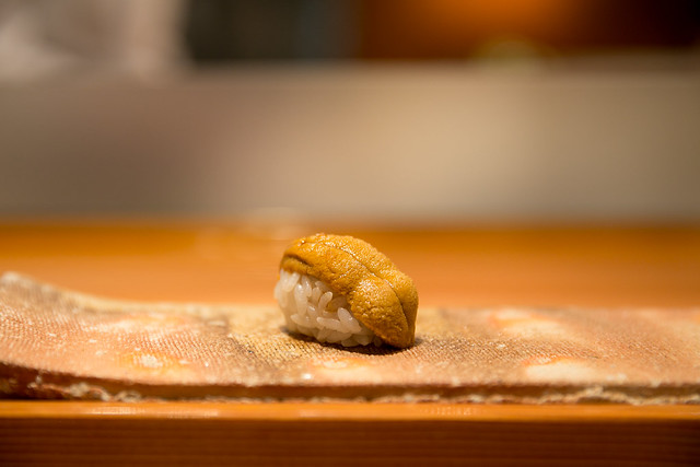 在海苔上放一小撮白飯,再蓋一片海膽,包起來吃就是人間美味。