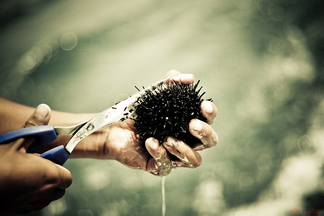 - 用剪刀從底部的嘴巴刺進去,之後剪出一個小洞或是直接剖半。可以隔著毛巾抓海膽,避免手被刺傷。
