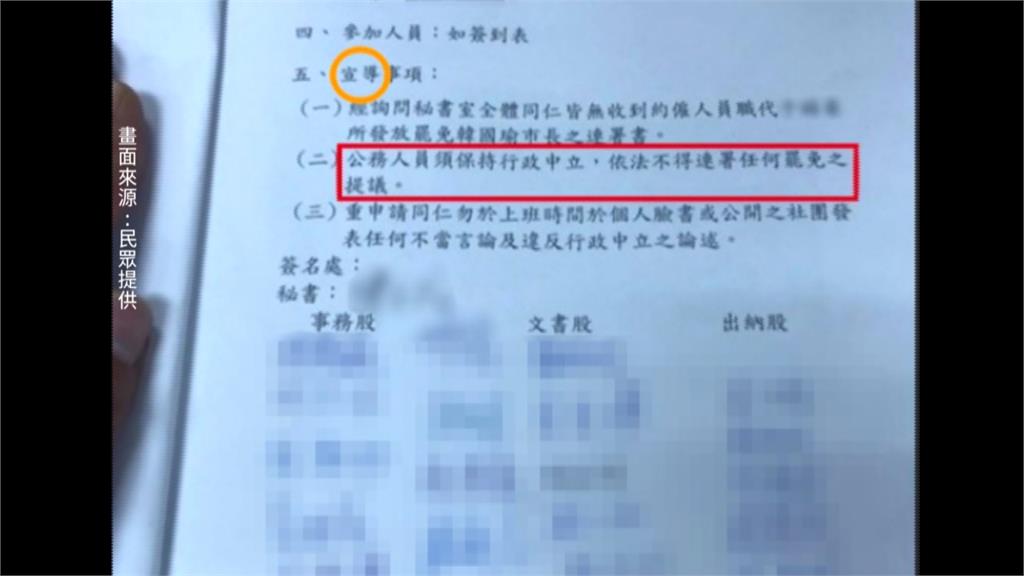 罷韓連署人數不斷衝高,高雄市府卻在幾天前流出這樣的公文。這是來自「公務人員維持行政中立宣導會議」的會議記錄,第二條宣導事項,要求公務人員「不得連署任何罷免之提議」,各局處人員看過後還要在下方簽名,引來議員群起痛批。