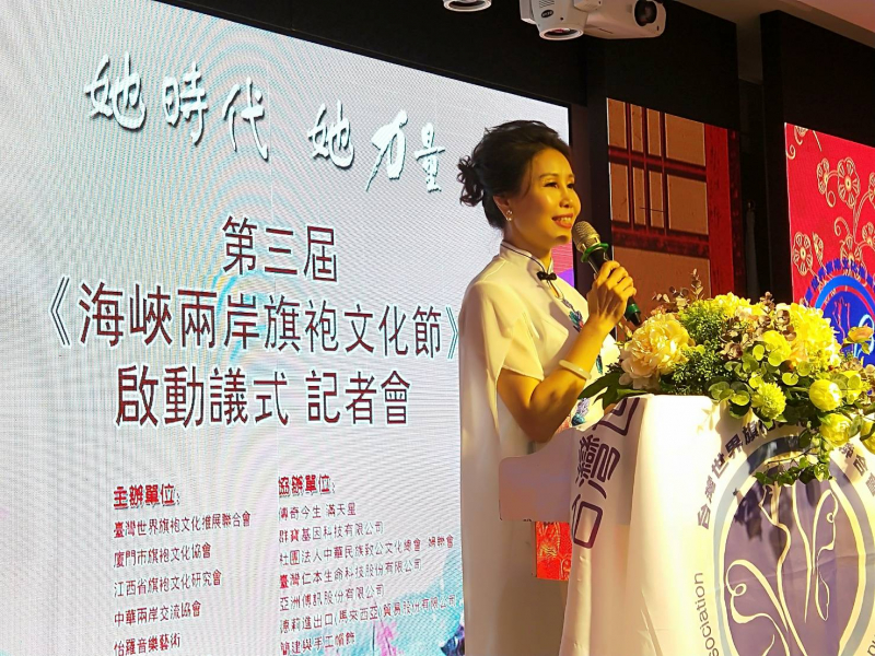 (記者張耀元報導)台灣世界旗袍文化推展聯合會.日前於7月28日下午在景美星靚點餐廳召開世旗會長強棒交接記者會。同步舉行第三屆「12月份海峽兩岸旗袍文化節」,此次活動對兩岸旗袍領袖出席的有:廈門市與江西省一行近50人,蒞臨現場的貴賓與致詞的有:中華民國對外貿易發展協會 副秘書長-林芳苗女士,原海基會經貿處處長 鄧岱賢先生,馬來西亞拿督陳乙德先生,韓國瑜藝人代表發言人熊海靈女士,波多黎各經貿處亞太地區代表-方經涵先生,怡羅音樂藝術指揮作曲家王柏力先生,傳奇今生滿天星營運總裁 李曉女士,群寶基因科技有限公司董事長 曾憲群及中華時報李董事長及謝社長等人。當日並與「廈門市旗袍文化協會」締結姊妹會儀式。